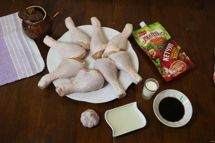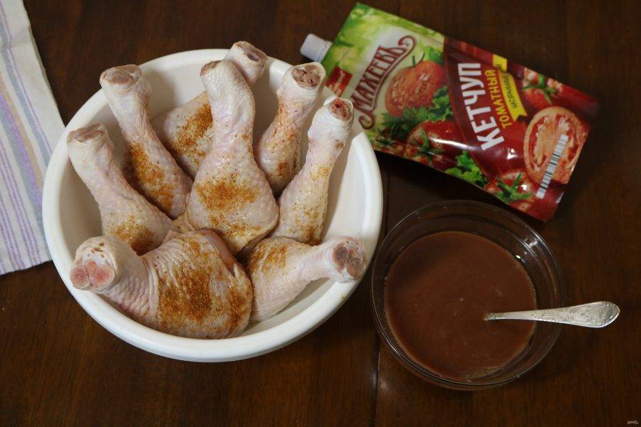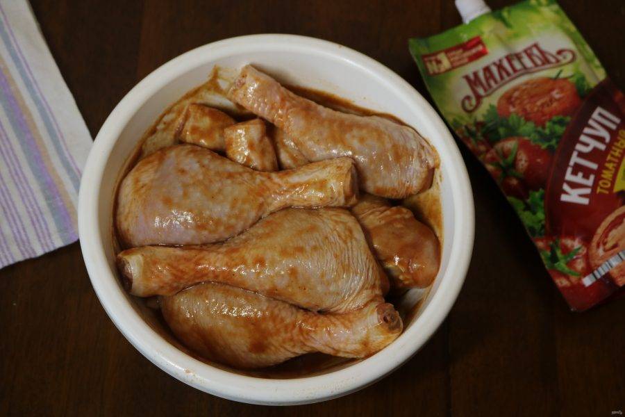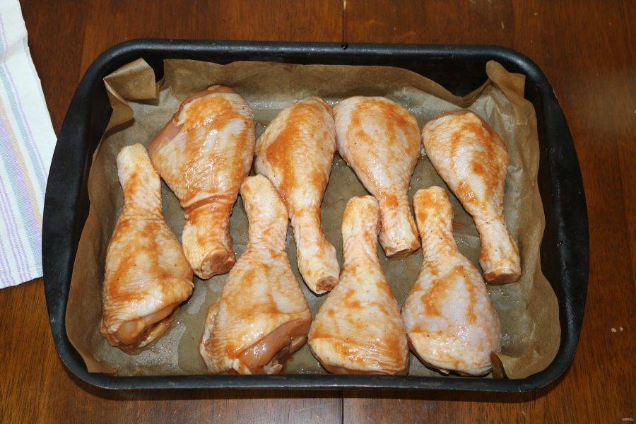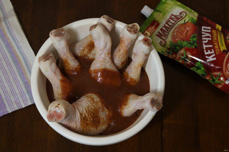 Приготовленным соусом залейте куриные ножки и хорошо обмажьте каждую.
