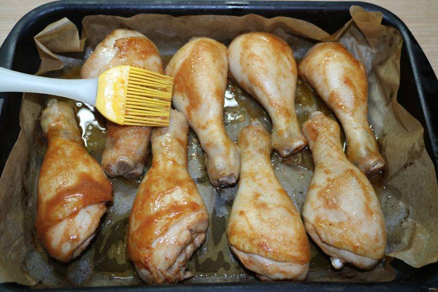 Запекайте ножки в течение 45-50 минут. Через 25 минут обязательно смажьте мясо оставшимся соусом с помощью кисточки.