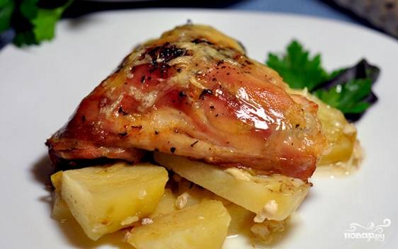 Налейте 100-130 мл. очищенной воды в форму. Поставьте блюдо в духовку, выпекайте 1 час при температуре 190 градусов. Чтобы ножки вышли румяными, каждые 15 минут смазывайте их соком и жидкостью с противня. По истечении часа лучше проверьте готовность картошки и мяса. Если картофель мягкий, посыпьте блюдо тертым сыром и отправьте его на пару минут обратно в духовку.