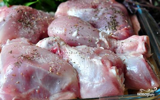 Теперь выкладываем сверху разрезанные пополам куриные ножки. Присыпьте их солью, перцем, а также мятой.