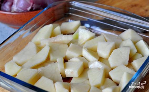Нарежьте картофель крупными кусочками, выложите его на дно формы для запекания.