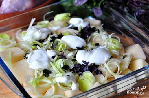 По поверхности картошки распределите лук (нарезанный кольцами), базилик и сметану.