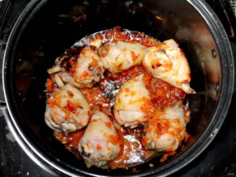 Куриные ножки сполосните, обсушите и выложите в чашу мультиварки на овощи. Все посолите, поперчите и посыпьте специями.
