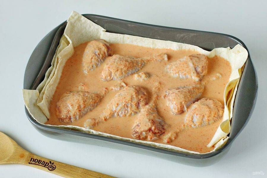 На лаваш выложите куриные голени. Голень предварительно промойте и обсушите.