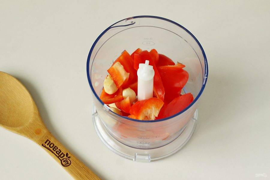 Измельчите перец и чеснок в блендере.