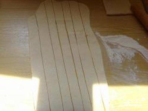 3. Слоеное бездрожжевое тесто немного разморозить. Раскатать его в пласт толщиной не более 0,5 см. нарезать тесто на тонкие полоски. Ширина полосок должна быть около 2 см.