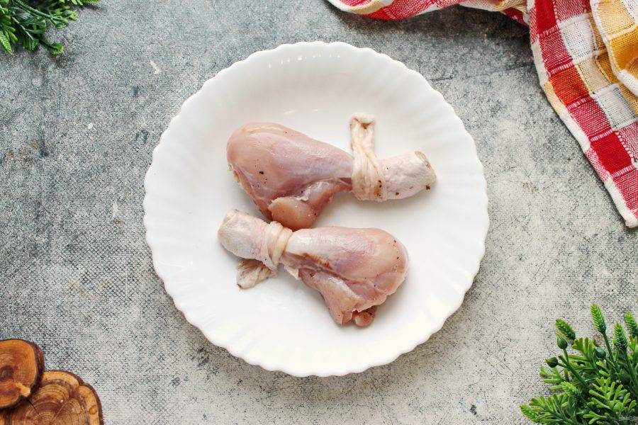 Подготовьте все необходимые ингредиенты для приготовления куриных ножек в слоеном тесте. Куриные ножки разморозьте заранее, а слоеное тесто достаньте из морозильной камеры за 30-40 минут до приготовления.