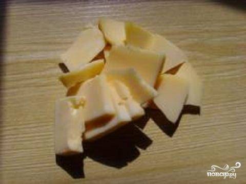 2. Твердый сыр нарезать тонкими квадратиками. Рассчитывайте по два кусочка сыра на одну ножку. Ломтики засунуть в каждую ножку между кожицей и мясом.
