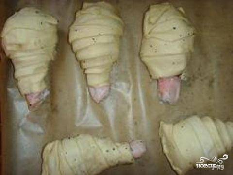 4. Взять куриную ножку и обернуть аккуратно ленточкой теста, чтобы не осталось видно мяса. Духовку разогреть до 200 градусов. На лист постелить пергамент и выложить туда наши ножки в тесте. Запекаются ножки около 50 минут. Когда тесто достаточно подрумянилось, вытаскиваем лист из духовки и подаем на стол.