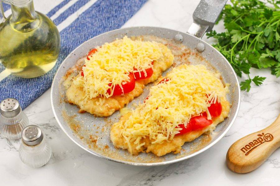 Натрите твердый сыр на терке с мелкими ячейками и присыпьте отбивные сверху. Убавьте нагрев до минимального и накройте емкость крышкой. Томите 2-3 минуты, за это время сыр пропарится и расплавится.