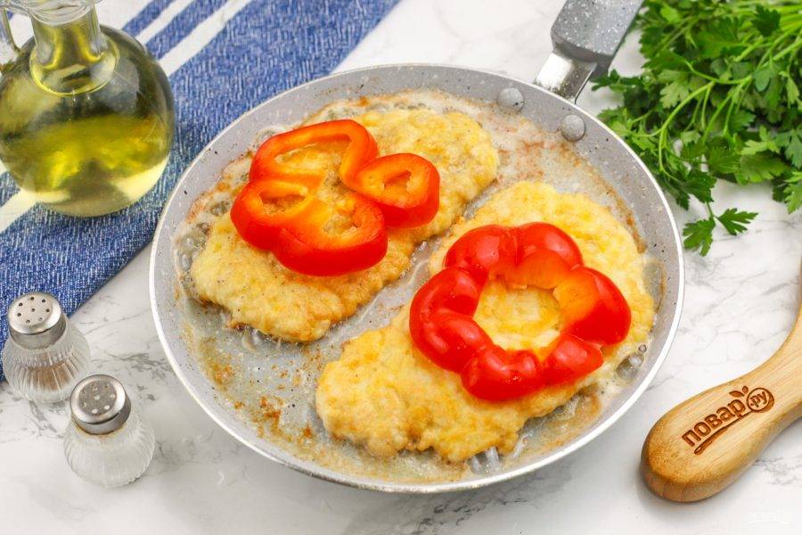 Промойте болгарский перец, удалите семена и нарежьте овощ кружочками. Выложите по кружочку на каждую отбивную.
