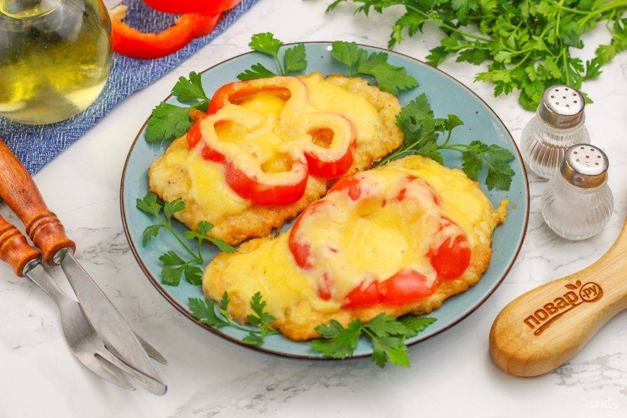 Выложите куриные отбивные с перцем на тарелку и подайте к столу горячими. Украсьте свежей зеленью или дополните гарниром. Приятного вам аппетита!