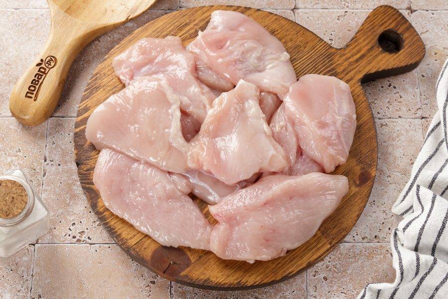 Куриное филе разрежьте на несколько частей.