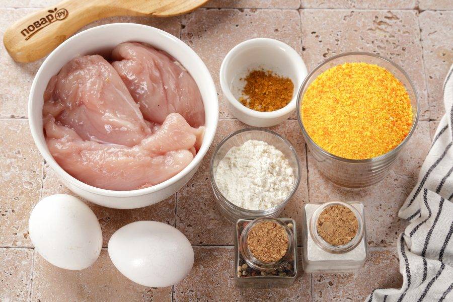 Подготовьте все ингредиенты по списку. Куриное филе промойте и обсушите. Чтобы готовые отбивные получились красивыми, а панировка плотно прилегала, сухари берите более крупного помола, насыщенно желтого цвета и уже со специями. Если у вас обычные белые сухари, самостоятельно добавьте в них для цвета паприки, куркумы, соли и перца по вкусу.