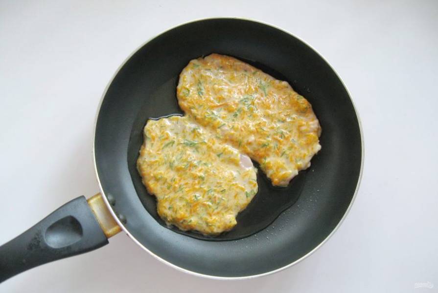 Приготовьте кляр для отбивных. Морковь очистите, помойте и натрите на самой мелкой терке.