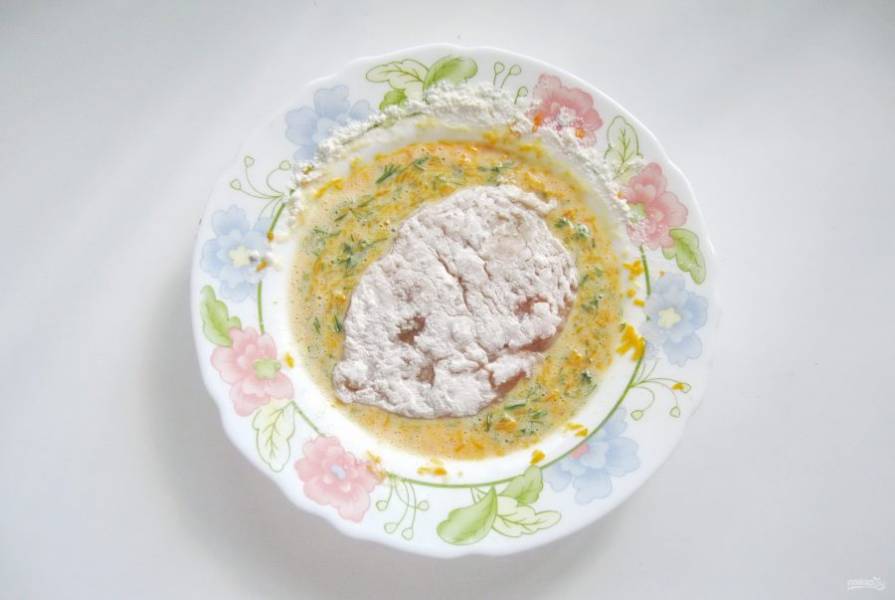 Куриную отбивную обваляйте в муке и обмакните в кляр со всех сторон.