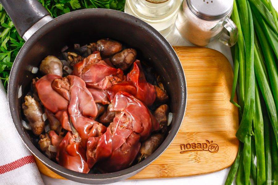 Промойте куриную печень, срежьте пленки и выложите ее в емкость. Обжарьте еще 4-5 минут до румяности печени.
