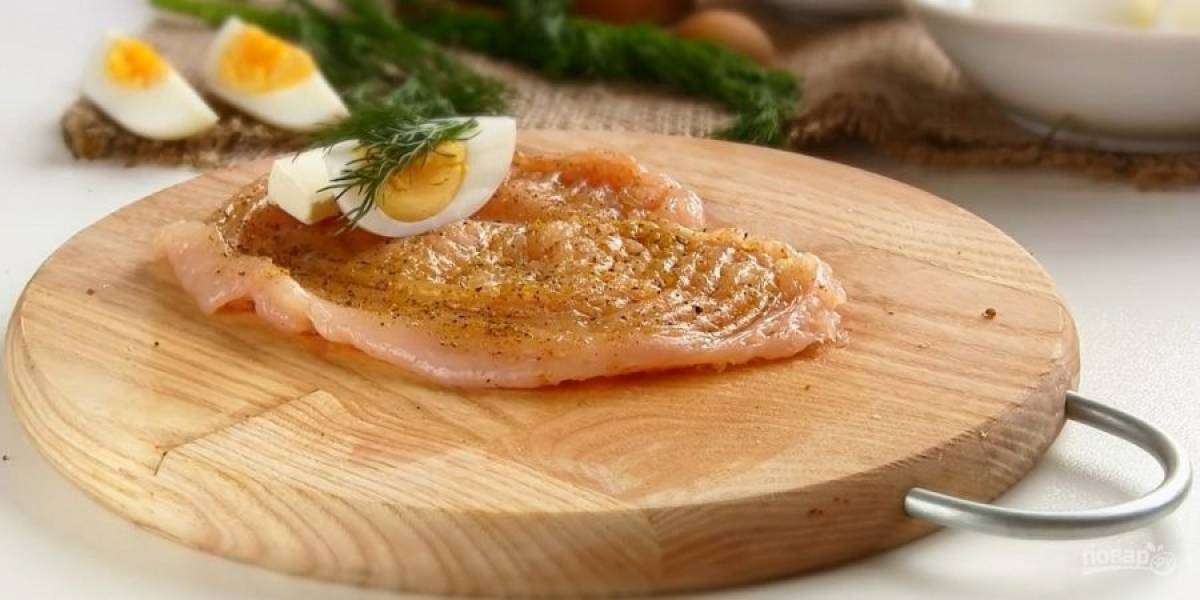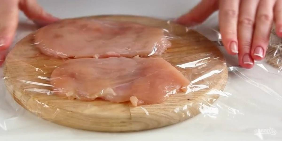1. Куриное филе промойте и промокните бумажной салфеткой. Нарежьте на приблизительно одинаковые пластины, накройте пленкой и слегка отбейте. Посолите, поперчите и смажьте специями.