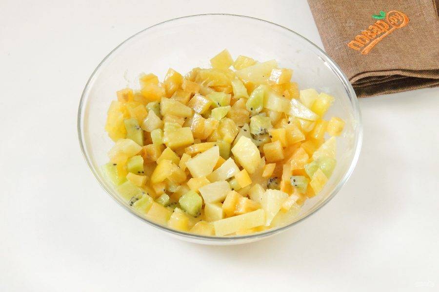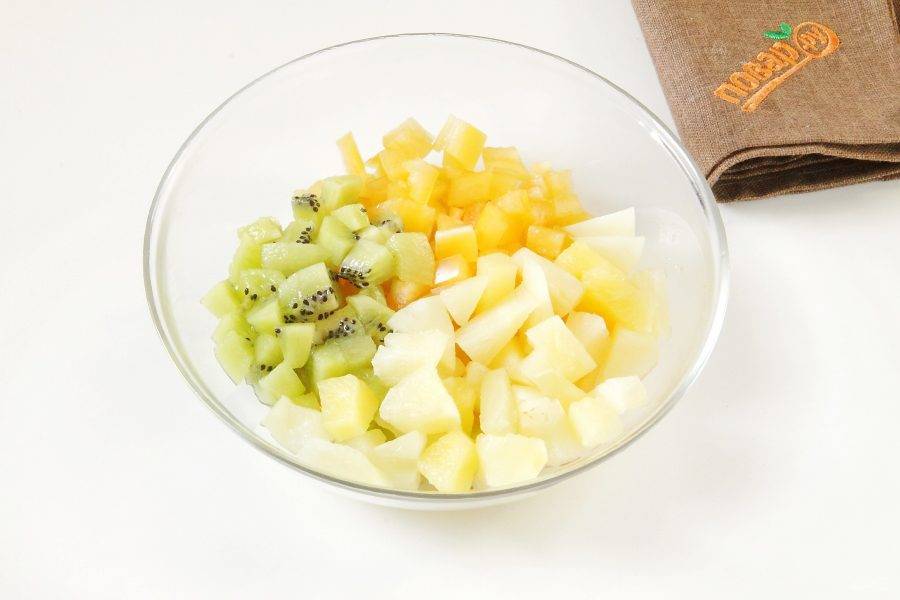 Соедините нарезанный кубиками болгарский перец, нарезанное примерно такими же кубиками киви и ананас кусочками. Если кусочки достаточно крупные, то можно их измельчить.