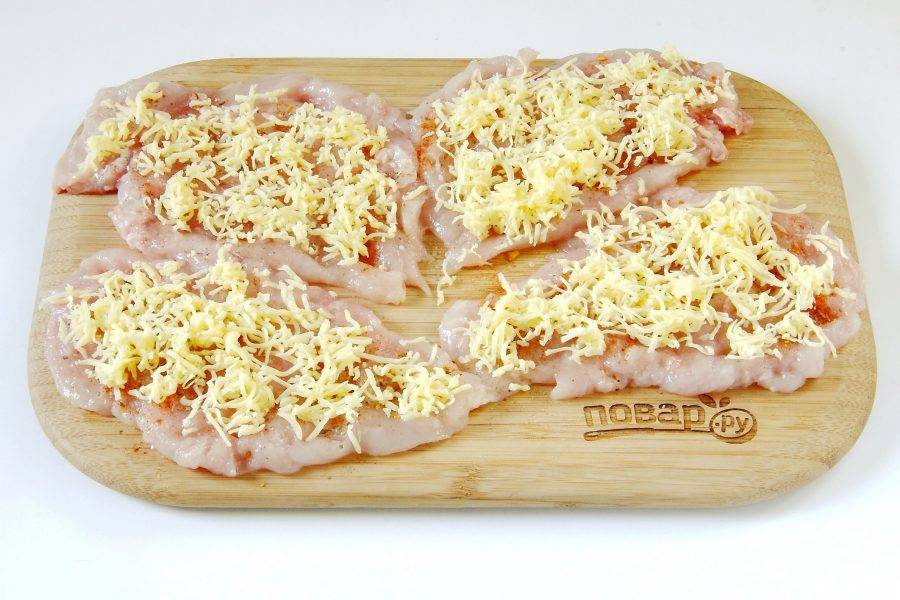 Посыпьте сверху тертым сыром (немного оставьте для верха рулетиков).
