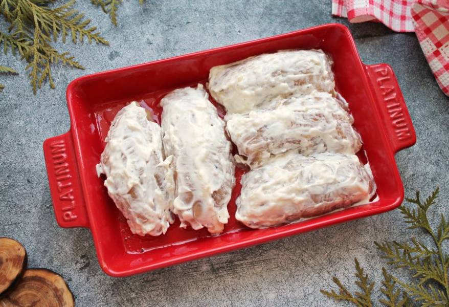Заверните рулетики, чтобы начинка была хорошо закрыта и выложите в смазанную растительным маслом форму для запекания.
