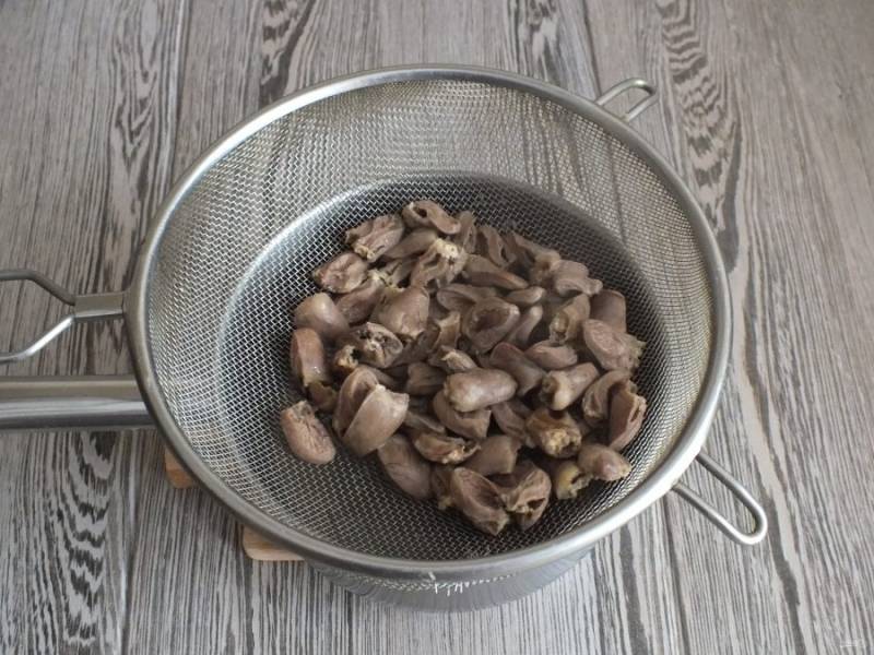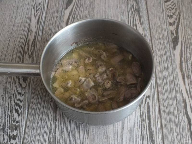 Куриные сердечки промойте, разрежьте на две половинки. Залейте водой и поставьте на огонь. Варите в течение 40 минут. Через 20 минут после закипания посолите.
