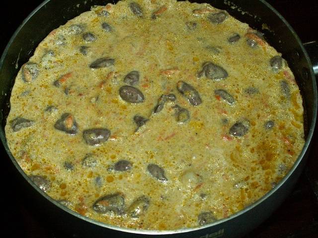 Добавляем к сердечкам сметану, доводим до кипения и даем покипеть на слабом огне минут 5-7. Вот и все готово!