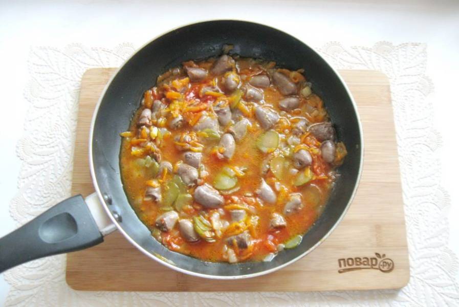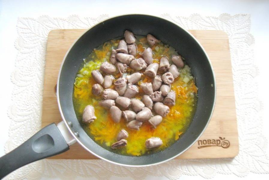 Сердечки выложите в кастрюлю с водой и проварите 10 минут с момента закипания. После добавьте в сковороду с луком и морковью.