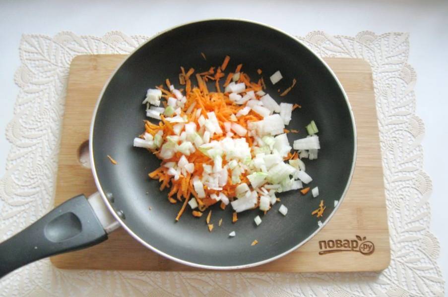 Репчатый лук очистите, помойте и мелко нарежьте. Добавьте в сковороду к луку.