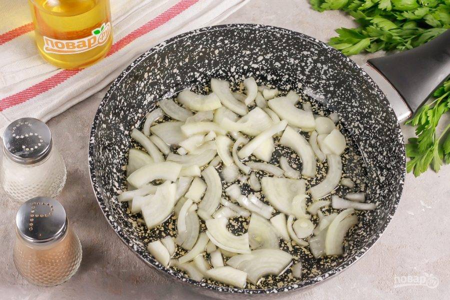 Лук нарежьте полукольцами. Прогрейте в сковороде масло и всыпьте луковую нарезку. Обжарьте примерно 3-4 минуты до румяности.