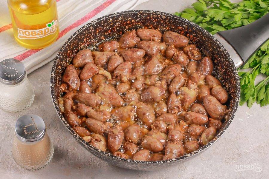Спустя указанное время сердечки отлично приготовятся, станут сочными и нежными на вкус, а лук разварится и загустит соус.