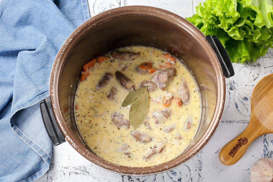Перемешайте, добавьте лавровый лист, установите функцию "Тушение" и готовьте сердечки около 1-1,5 часов, чтобы они стали мягкие.