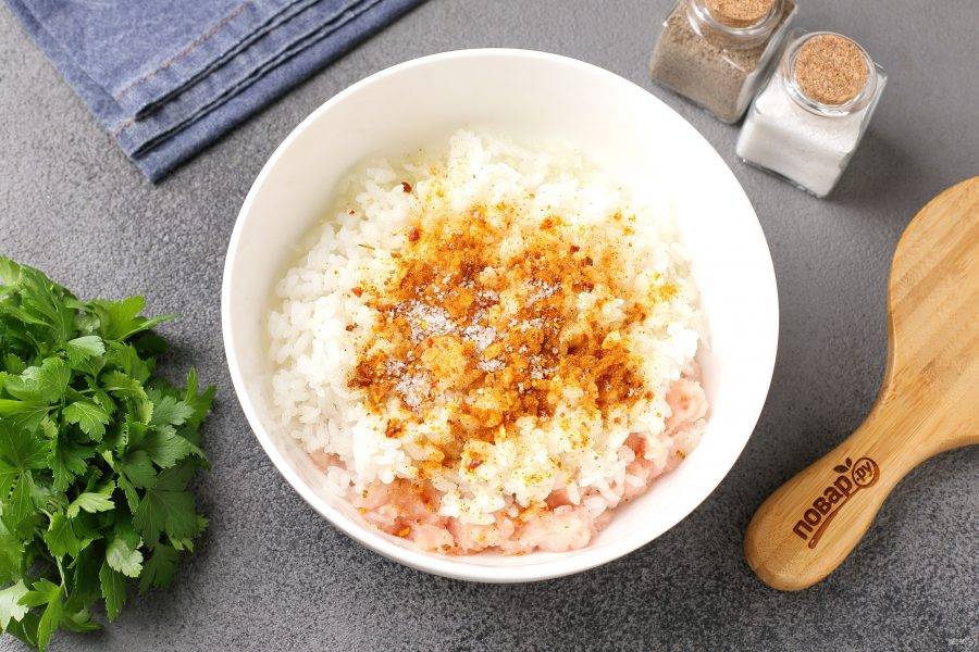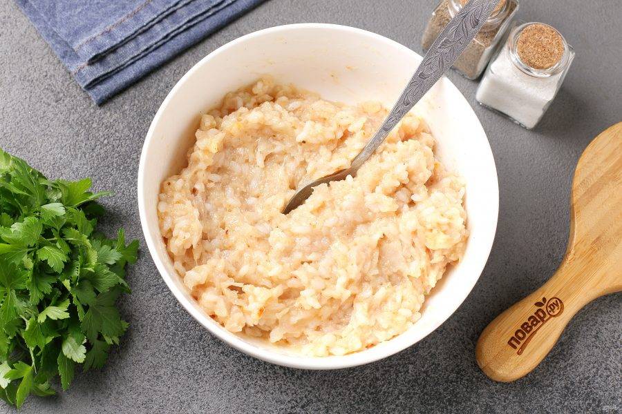 Рис отварите до полуготовности, промойте и добавьте к фаршу. Добавьте сюда же тёртый на крупной тёрке лук, соль и специи по вкусу.