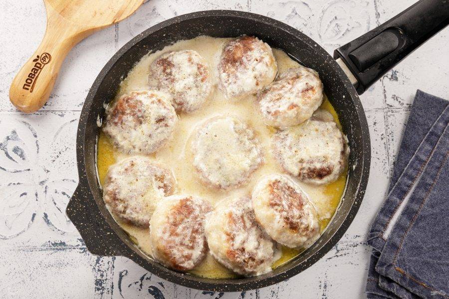 Влейте к тефтелям сливочный соус. Он достаточно жидкий, но при дальнейшем тушении загустеет. Накройте сковороду крышкой, огонь сделайте минимальным. Тушите 10-15 минут, в зависимости от размера тефтелей.