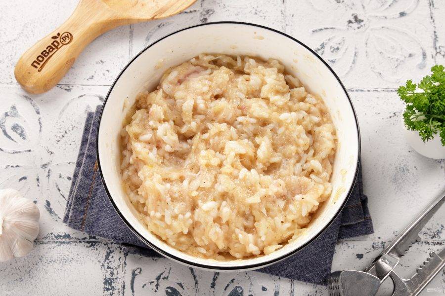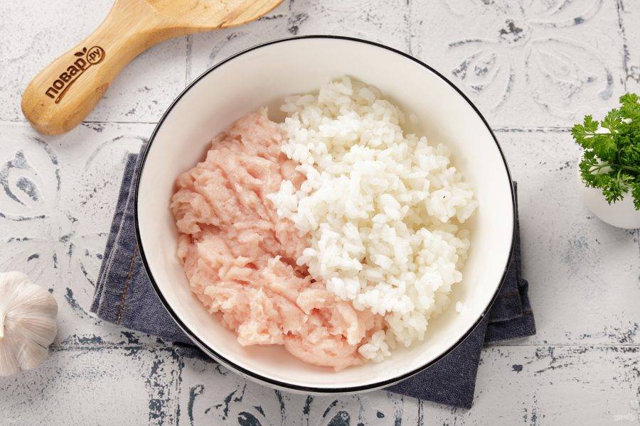 В глубокой миске соедините фарш и отваренный рис.