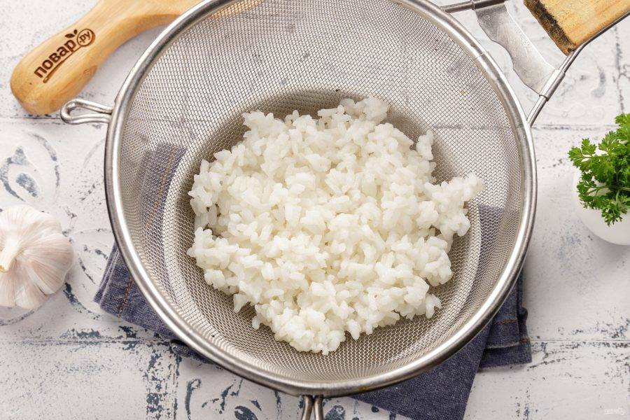 Рис промойте и отварите почти до готовности, откиньте на сито.