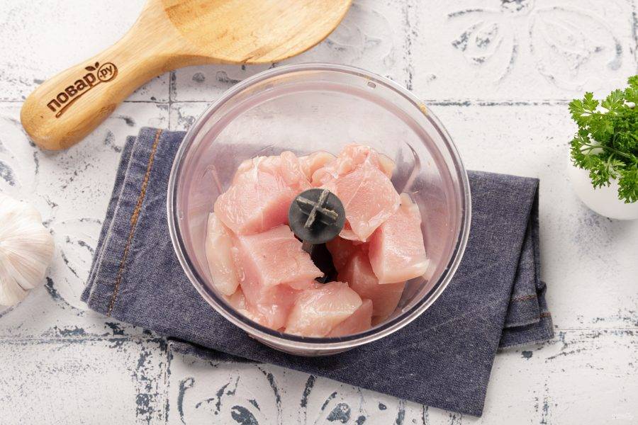 Мясо промойте, обсушите и нарежьте небольшими кусочками. Переложите в чашу блендера.