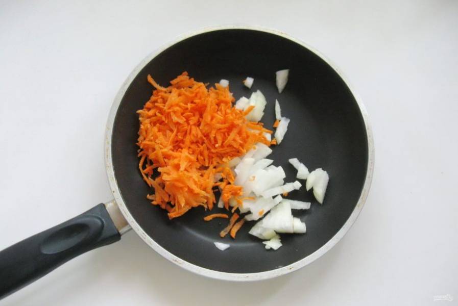 Одну небольшую луковицу и маленькую морковь очистите, помойте. Лук мелко нарежьте, а морковь натрите на терке. Выложите в сковороду и налейте 20 мл рафинированного подсолнечного масла.