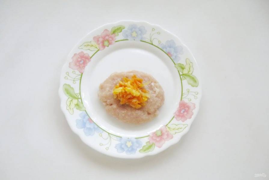 Из порции фарша сделайте лепешку, на середину которой выложите чайную ложку начинки.