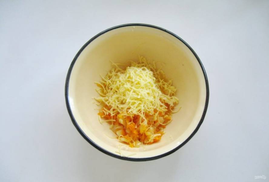 Жареные овощи переложите в миску и добавьте тертый сыр. Перемешайте, начинка для зраз готова.