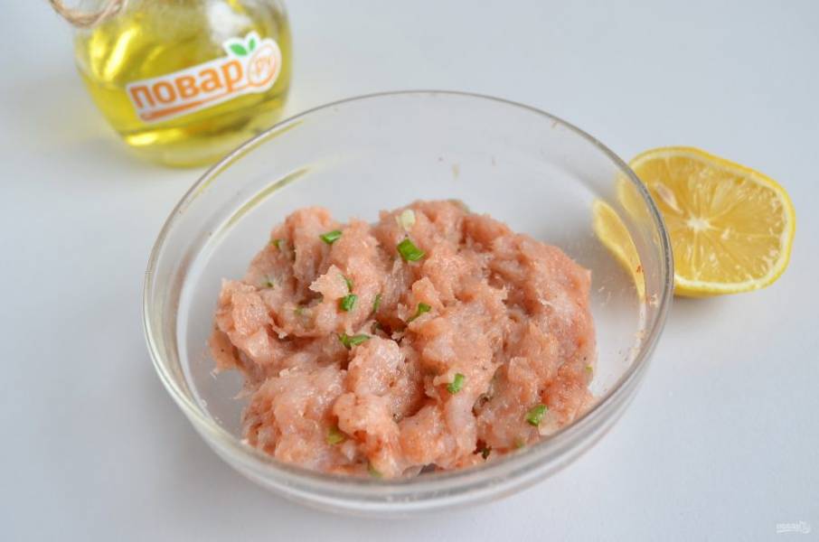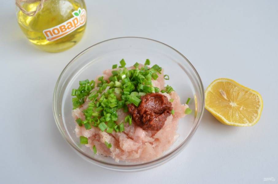 2. Куриный фарш соедините с пастой, лимонным соком, зеленым луком, специями (соль, перец черный, тмин, кайенский). Перемешайте. Если фарш очень сухой, можно добавить яйцо на каждые 450 г фарша.