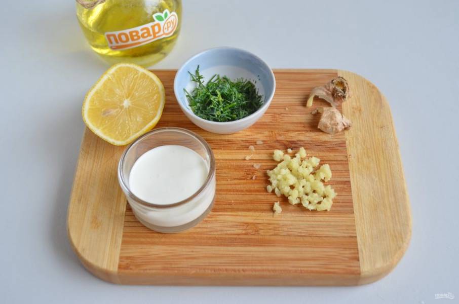 5. Приготовьте соус: соедините йогурт натуральный с лимонным соком, рубленым (мелко) имбирем (с него предварительно снимите кожуру), зеленью и молотым тмином. Соль — по вкусу и желанию, я не добавляла.