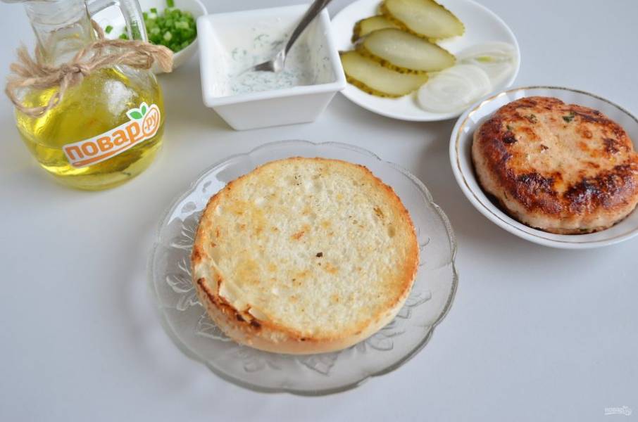 6. Булочку порежьте вдоль на две части. На масле от жарки котлеты обжарьте обе половинки булочки с внутреннем стороны. Приступаем к сборке бургера. На тарелочку положите нижнюю часть булочки.