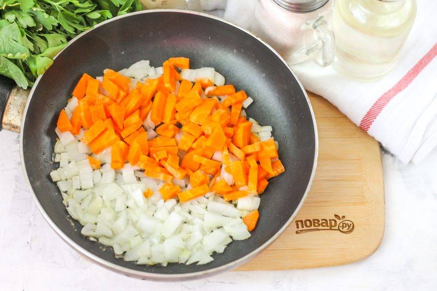 Очистите от кожуры морковь и репчатый лук. Промойте и нарежьте овощи мелкими кубиками. Прогрейте в сковороде растительное масло и обжарьте в нем овощные нарезки до румяности примерно 3-4 минуты, выключите нагрев.