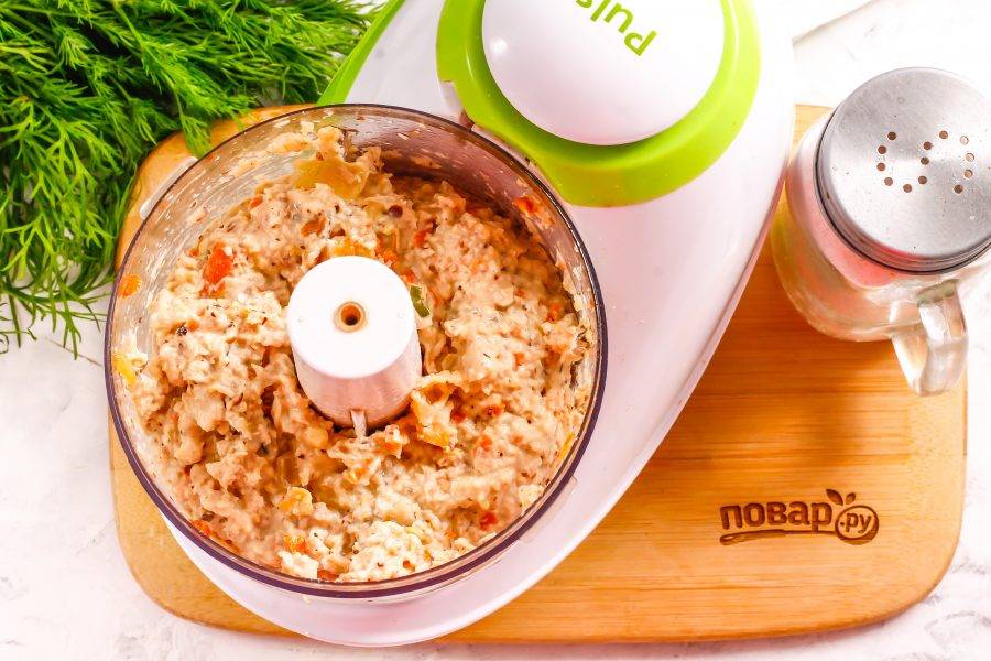 Измельчите все содержимое емкости в течение 3-5 минут на пульсирующем режиме. Если мясо будет измельчатся с трудом — влейте еще немного бульона.
