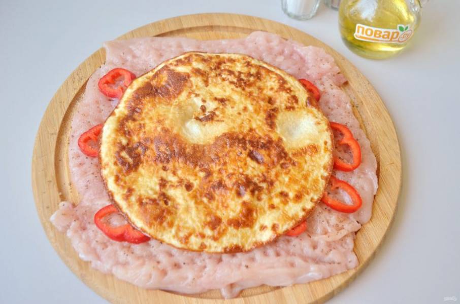 2. Сначала нужно сделать омлет. Для этого взбейте два яйца с 2 ст. л. молока, щепоткой соли и перца. На чайной ложке масла приготовьте омлет.