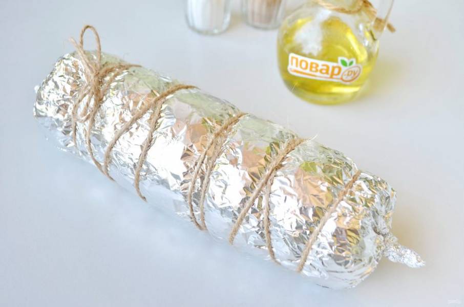 7. Сверните туго мясной рулет. Заверните в несколько слоев фольги, перетяните ниткой. Опустите в кастрюлю с кипящей водой и варите 40 минут. Выключите кастрюлю и оставьте остывать мясо на 30 минут. После чего достаньте рулет, положите в пакет и отправьте в холодильник на 2-3 часа.