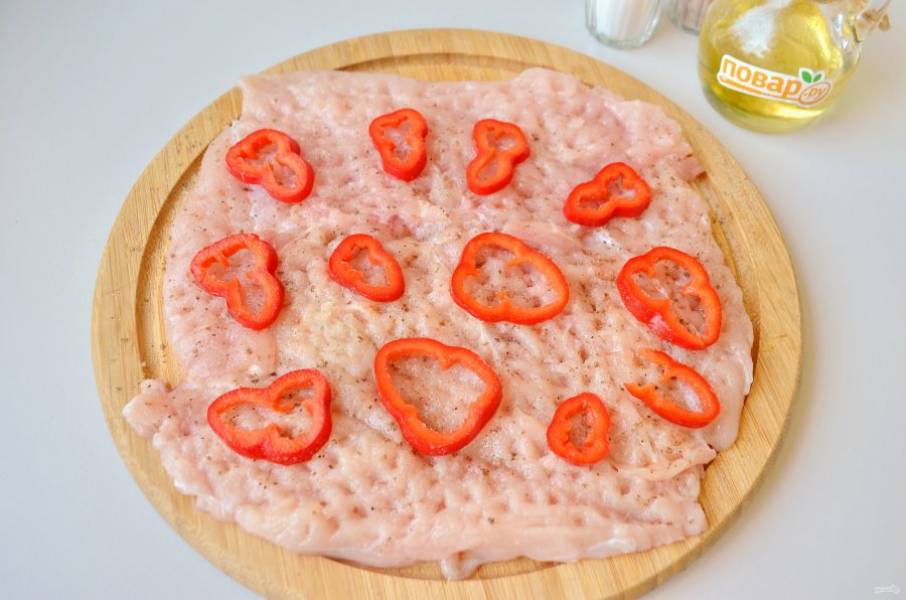 3. Куриное филе отбейте хорошо с одной стороны, положите так, чтобы мясо образовало прямоугольник. Там где стыки, лучше положить мясо внахлест. Посолите, поперчите, я еще посыпала чесночным порошком.