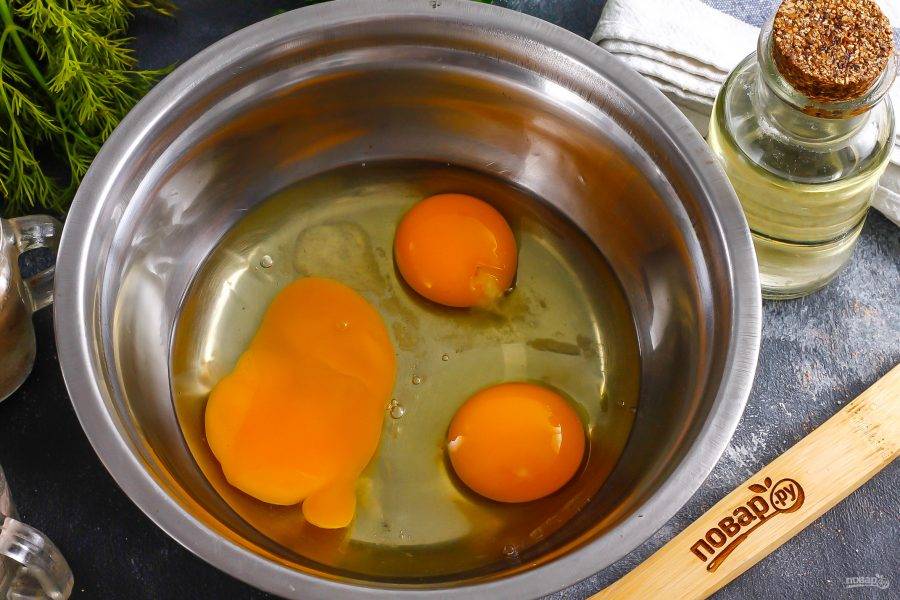Вбейте в глубокую емкость куриные яйца, влейте воду и всыпьте 2 щепотки соли. Взбейте все.