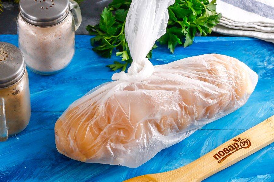 Отбейте кулинарным молоточком, выложив мякотью вверх.